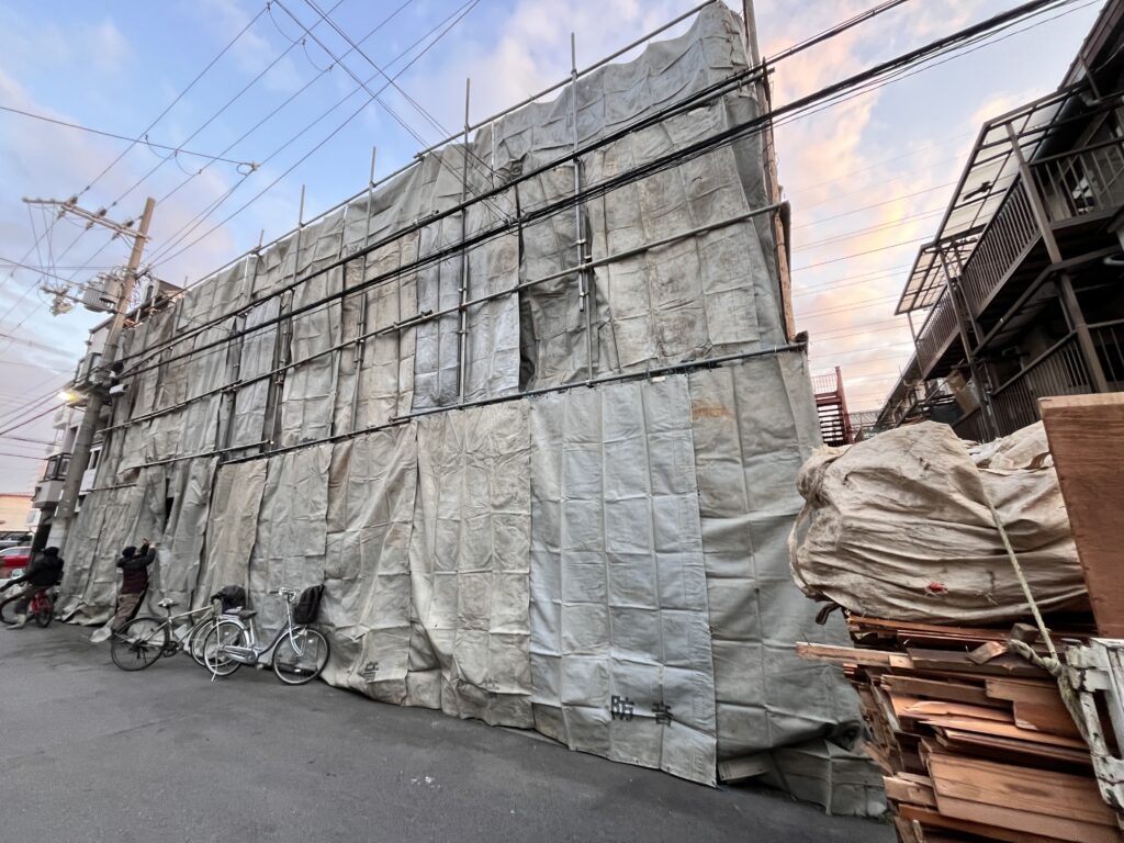 足場と並行に埃防止の防音シートを張っていくちなみに、シートの厚みがたっぷりで瓦礫の落下や防音効果は高いが重たい!