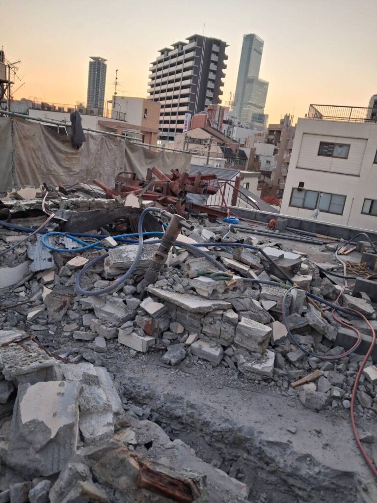 大阪市生野区鉄骨解体 2025年11月21日 最終更新日時 : 2025年11月21日 リワーク株式会社 道路幅が2トンかつかつの2,5メータの道大型ユンボやクレーン入らず、時間はかかるがコンプレッサーブレーカでの斫りとガス切でちょっとずつ進めて安全第一でで大阪住之江に