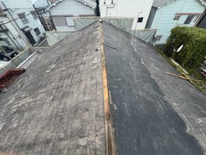 足場と防音シートでの養生終わったら晴天の日は瓦落としから、釘が無数に打ち付けて有って、剥がしにくいがそこは精鋭揃いのリワークです。大阪住之江から30分程で到着します。