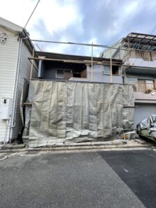 先ずは足場からシート張りの、一日を大阪住之江から明日も続きのシート終われば瓦を屋根から卸処分