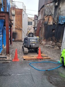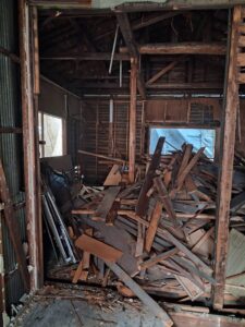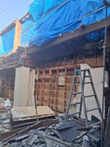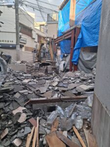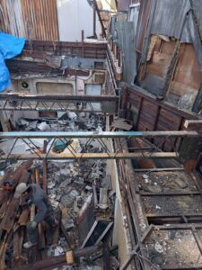 進めるにつれ鉄骨の補強も色々な所に使われてて、鉄骨切断をガスで溶断するので、木材を綺麗にかたずけて水をたっぷりまき火事にも細心の注意で大阪住之江にあー未だ緊張続く