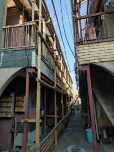 何処までがバラしてよく、どこからは保全しなきゃがとても分かりにくい切り取りでどちらが先に建てて、どちらが鉄骨の補強をどこまで下の川慎重に細心の注意で緊張する大阪住之江