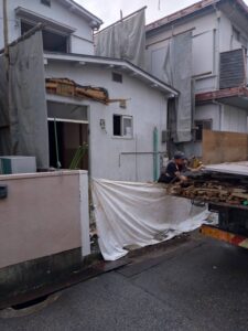 神崎川のすぐ近くの大阪と尼崎の境目部分での木造居宅解体大阪住之江からは200円高速と43号線で30分掛からない、顧客の希望で柱や梁など生け捕り希望で、バールとチェンソーで確実にバラしていく