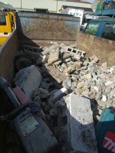居宅の手バラシ円滑に進める前にダンプを止めておくと車の離合が厳しく、此処は大ハンマーとチッパーで全面のCB塀を先行して解体する事に、作業終了待って、大阪住之江へ処分して空車で車庫へ