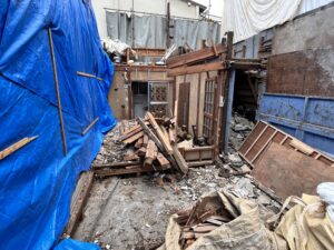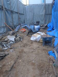上屋の撤去も時と共に進んで後は瓦礫土砂と基礎土間の撤去、人力ではどうしても一服時間が多くここはミニミニ500キロ程度だけどそれでも10人力以上で土砂をかき集め、基礎土間はミニのアイヨンで砕いていく