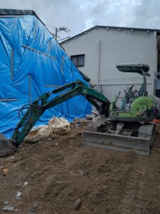 伊丹市の掘削や此花区切り取りなど雨で遣り難い現場を空けて此処に集中角地で近所への配慮とこれからやり易くする為、ダンプを屋内に入れるよう注力ほぼ一日雨だったが濡れる事無く大阪住之江に帰社