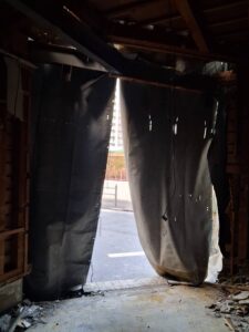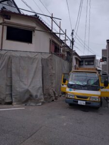 裏が狭くて色んな形に壁面なってる為大分かかった割に足場防音シート半分ほどしか進まず、角地の難しさ判明、しかしユンボ入れたら角地でもあり,早々に済ませて大阪住之江へ